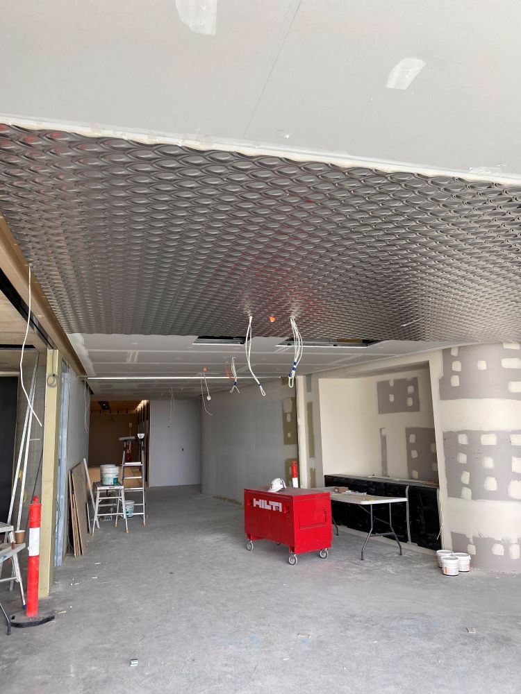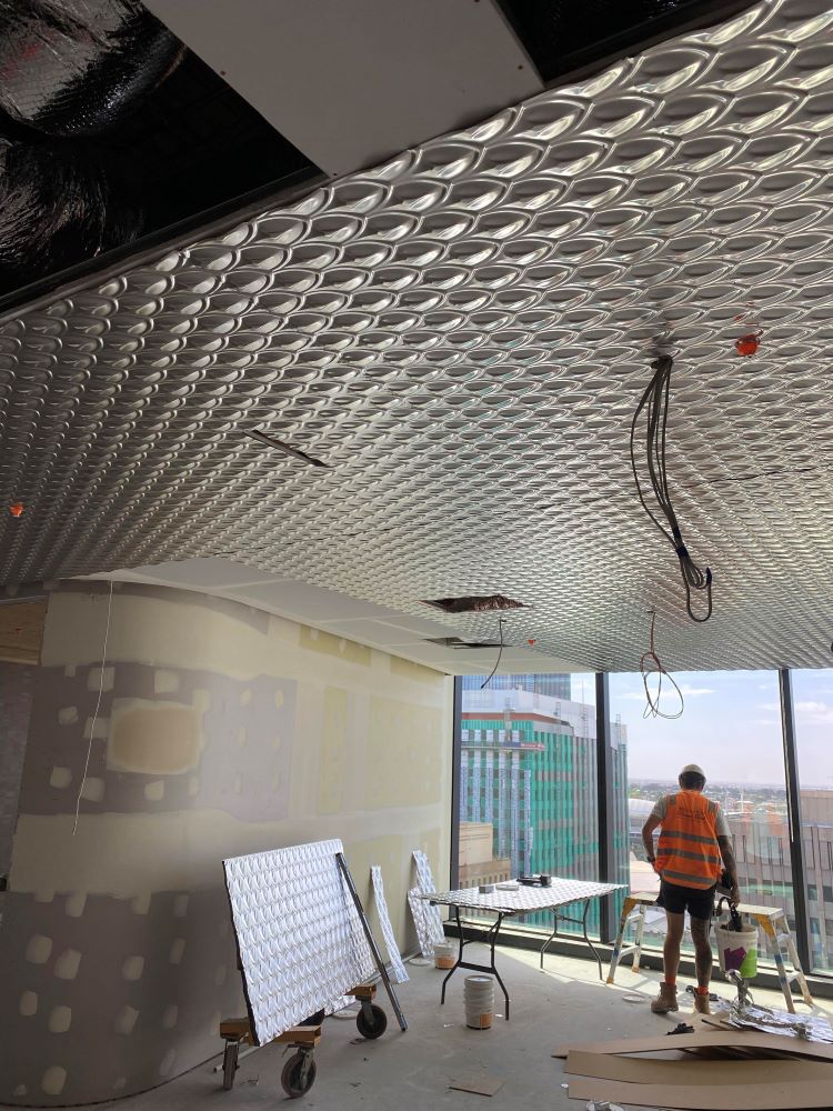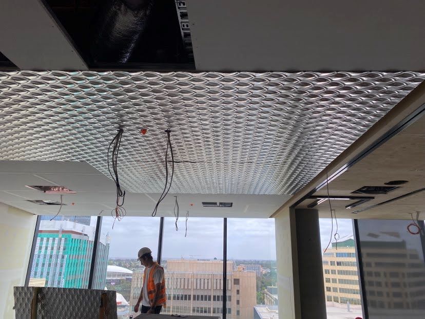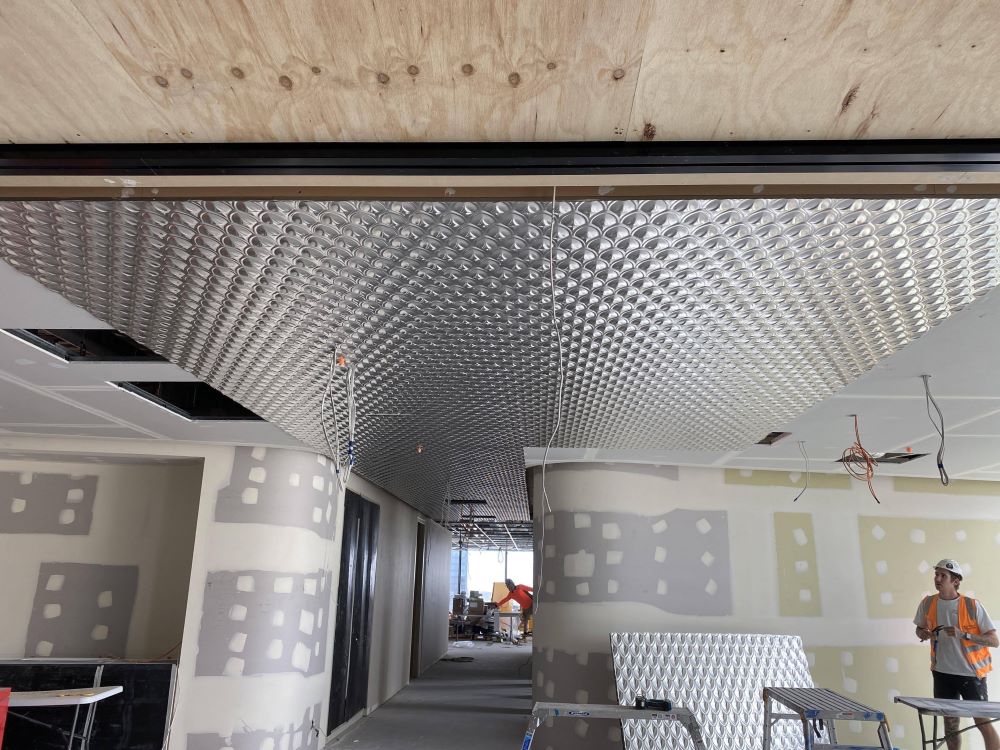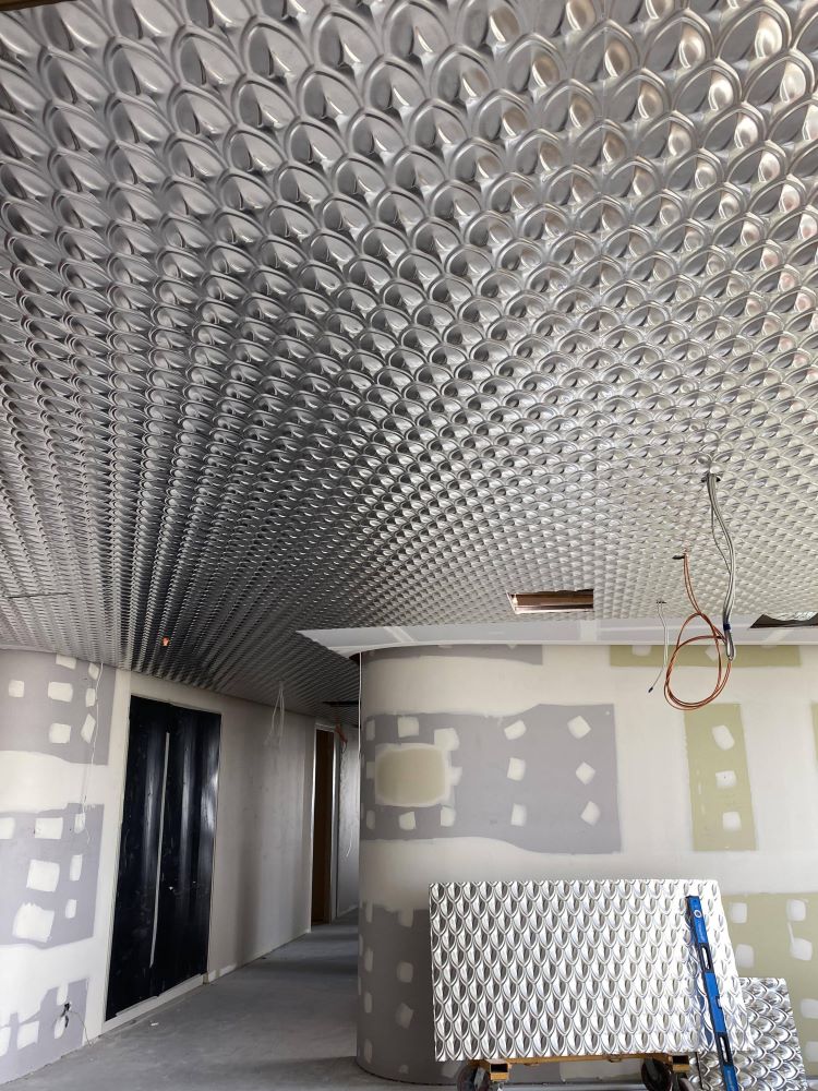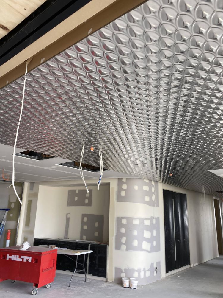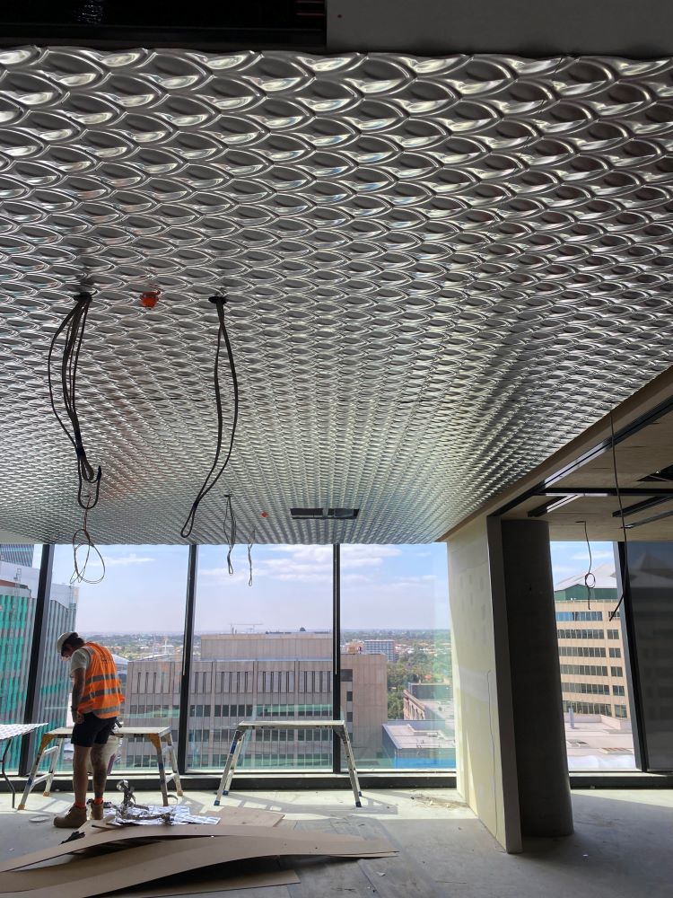 Project DescriptionAdelaide Pressed Metal were contracted by Exclusive Commercial Linings to supply & install approximately 70 square metres of pressed metal panels to the ceilings throughout the common areas & meeting room in the newly reburbished offices at 60 King William Street, Adelaide CBD. The pressed metal design chosen by the interior designer was Medium Fishscale supplied in 900mm x 1800mm panels. This panel is traditionally used as a roofing & cladding material & has no traditional overlap unlike typical pressed metal ceiling panels. The absence of an overlap along with pattern matching, odd angles & working to a shadowline around the ceiling perimetre made it a more challenging installation. Medium Fishscale has a deep profile pressing which required highly skilled workmanship in the cutting of the angles to follow the curve of the walls, millimetre perfect. Mechanical & electrical penetrations all needed to be cut out asthetically & also millimetre perfect. All panel overlaps were gapped and prepared ready for priming & painting. The experienced team at Adelaide Pressed Metal worked around other trades & services and to a strict timeline & schedule, completing the project in 4 days. Adelaide Pressed Metal also worked on the restoration of the Deco fascade of the original building as part of the heritage restoration project (see 60 King William Street Article) & are proud to showcase a mix of heritage restoration and modern application of our pressed metal products & skilled workmanship by our experienced team.