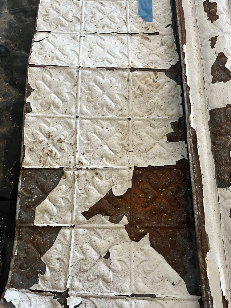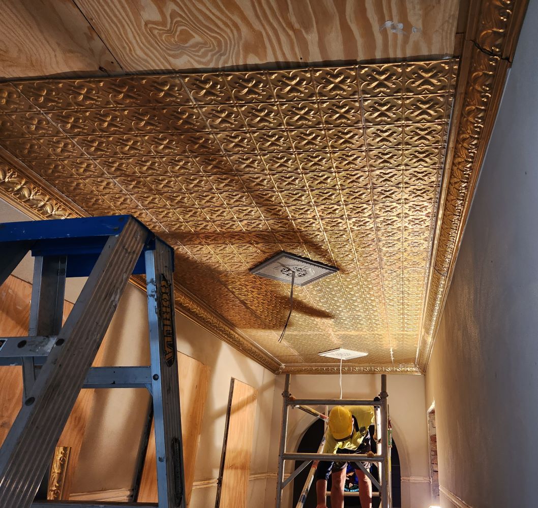 Scope of Contracting WorksReplace & install original rusted pressed metal panels like for like. Create new cornice die like for like to replace original cornice. Create bespoke replica ceiling rose vents to replace original rusted ceiling rose vents.