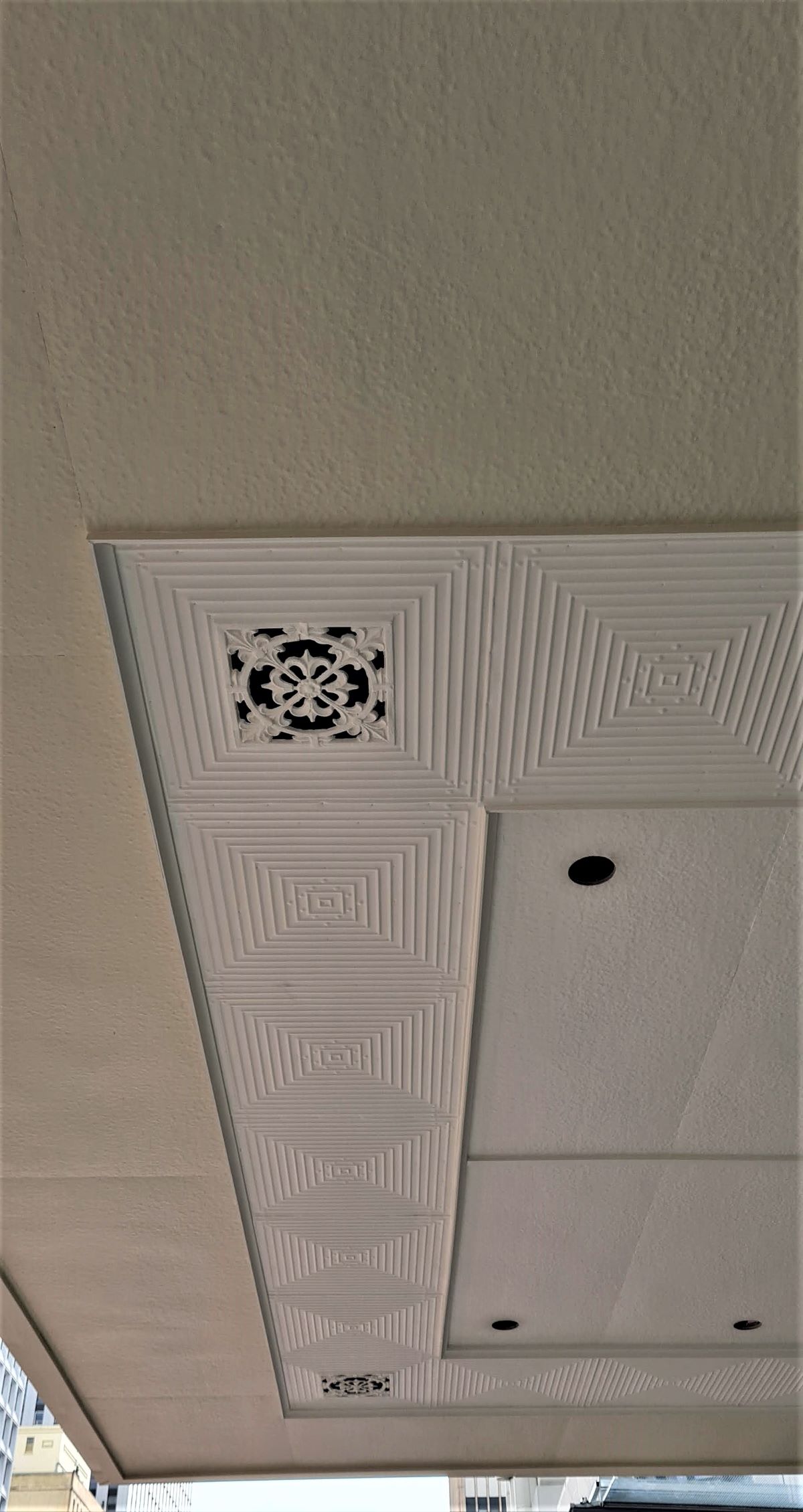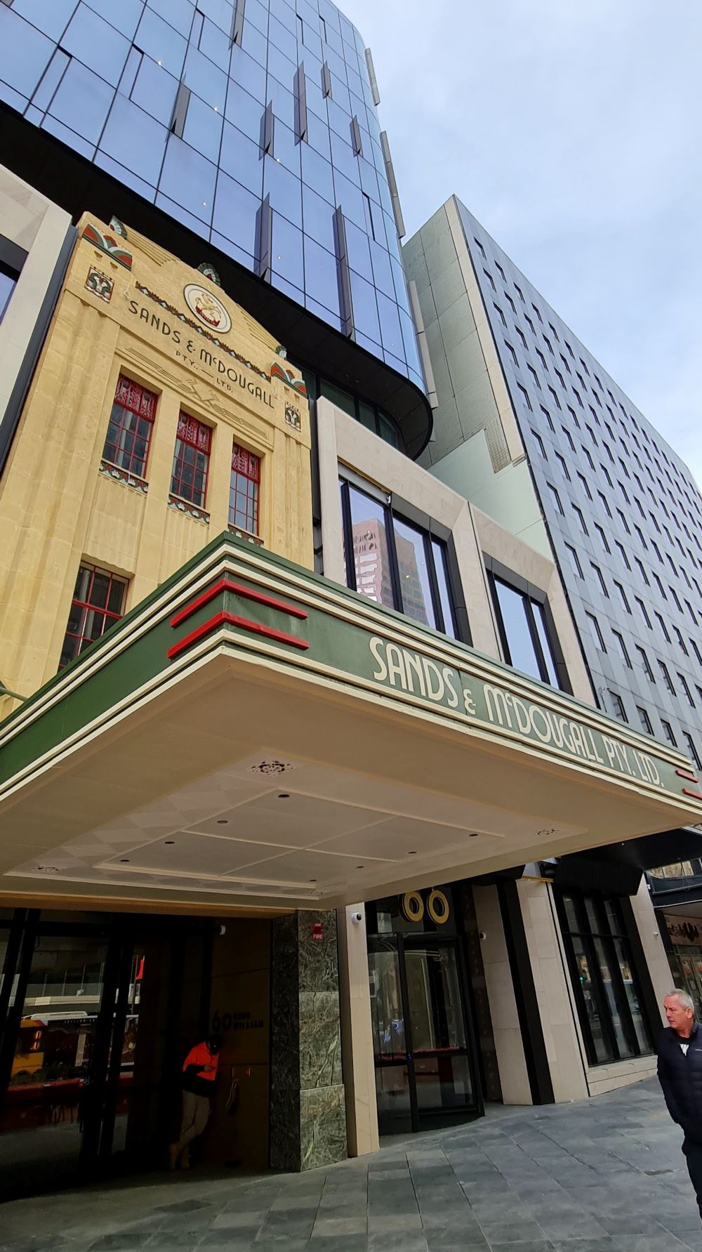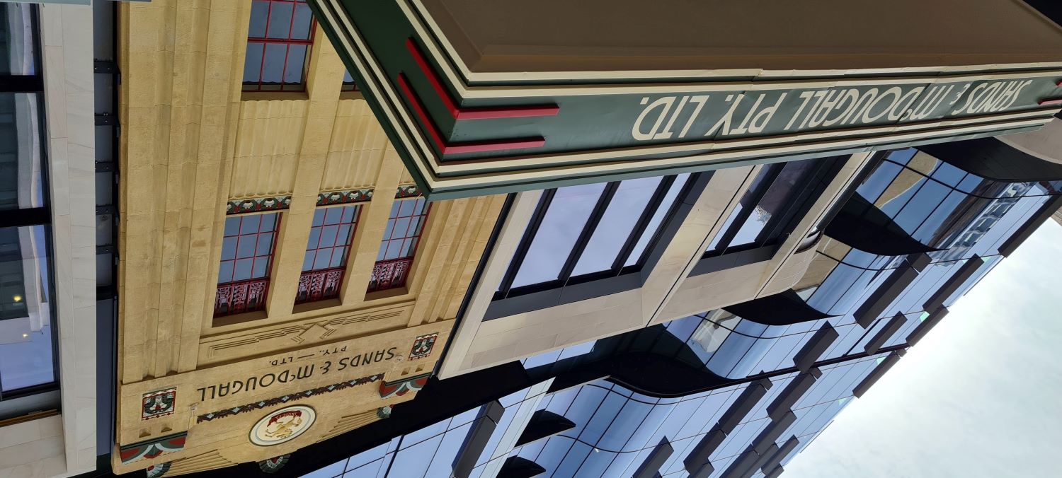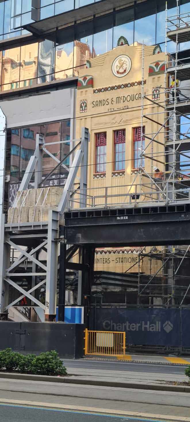 Adelaide Pressed Metal were contracted to carry out works on the Heritage Listed Sands & McDougall Building to repair & restore the original pressed metal verandah ceiling & metal cantilever verandah awning to original condition. Originally 19th century classical style architecture, the facade of the building was remodeled in 1933 to the Art Deco Style in fashion at the time. The original cantilever awning was removed to an offsite location so that repairs to the building facade could be underpinned & restored. The awning was cut in half, taken down & transported to a warehouse where Adelaide Pressed Metal dismantled & repaired the framing of the verandah. The pressed metal was dipped in baths to remove the paint & as much original pressed metal was salvaged as possible. The timber framework was replaced & ceilings battened in preparation for the reinstallation of the pressed metal. Approximately 60% of the original pressed metal material was able to be salvaged with new pressed metal, Lindfield Large design 600mm x 600mm & Fine Roughcast design as the border pattern matching seamlessly with the old original pressed metal. The original pressed metal vents (4 of ) were stripped, restored, soldered together & reinstalled. Due to the closeness of the building to the road the metal awning facades' Art deco features had  taken some heavy vehicle damage over the years especially on the corner of the awning. Adelaide Pressed Metal  refolded and restored the original metal awning facade to the original Art Deco detail.