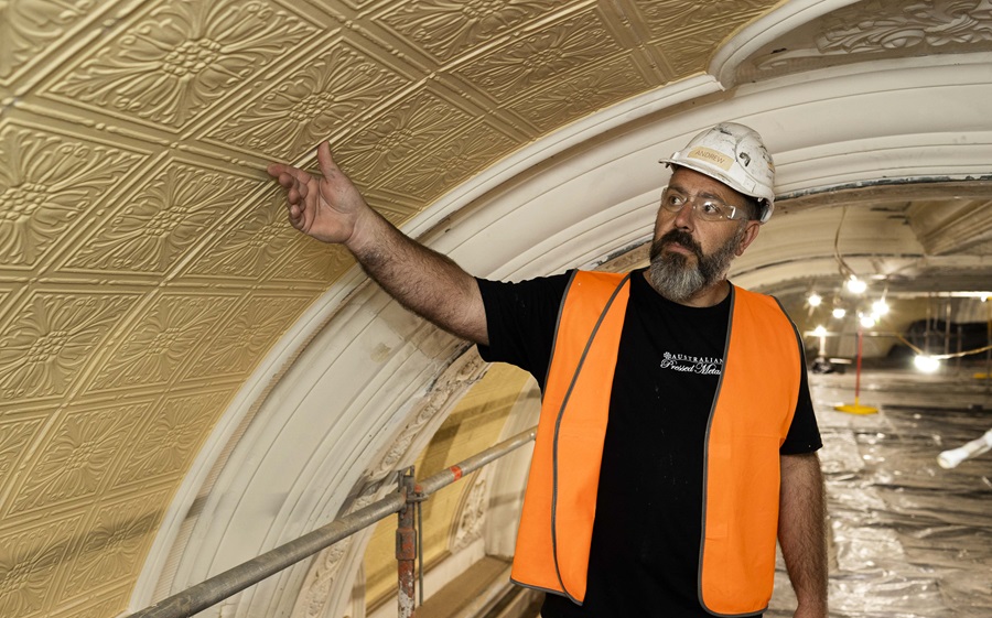 Project DescriptionAUDITORIUM STAGE 1. Demolition of the pressed metal ceiling under the dress circle with panels salvaged for future reinstalment. Repair & restoration of pressed metal Auditorium ceiling. The Wellington Town Hall is a Category 1 historic place on New Zealand's heritage list. The heritage architect report required authentic & sympathetic restoration of the original pressed metal ceiling in the Auditorium, circa 1904. National Pressed metal was the nominated contractor due to their expertise & extensive experience working on large scale restoration projects. Major restoration and repair works were carried out by National Pressed Metal and the teams from Melbourne Pressed Metal, Adelaide Pressed Metal & Stamp Pressed Metal for the Australian Pressed Metal Group on the Wellington Town Hall Auditorium ceiling in Wellington New Zealand. Works started in early 2020 & due to the pandemic stage 1 was completed in September 2024. Through this time National Pressed Metal worked closely with the builder & heritage architect to keep progress moving ahead through the challenges of lock downs, material shortages, flight restrictions & timeline extensions. The highly experienced National Pressed Metal teams were contracted to restore & repair the pressed metal ceiling to original condition, working closely with heritage architects & builder Naylor Love. A section of the original pressed metal ceiling in the Auditorium was carefully removed to give crane access for work on the seismic structural steel beams to be installed, asbestos removal & fire sprinkler system installation. Construction of a trapeze trampoline scaffold (wall hung only) for ceiling works, was installed allowing the original pressed metal panels to be meticulously unpicked & carefully reinstalled once repairs & restoration work was completed, for a seamless finish done to perfection. Deterioration of the original ceiling panels, damage & inferior patching & repair works over the previous century required a team with expertise, skill & knowledge of the pressed metal elements & their installation. Two new dies were created - Botanica & Bodkin, as the designs were not in production. These designs were pressed in premium O Grade aluminium to the original imperial measurements & fit in seamlessly where repairs & replacement panels were required. The original Celtic beams that followed the curve of the ceiling had been damaged & portions removed over the years for lighting & anchor points for speaker trusses. New unobtrusive anchor points were designed off the wall. The Celtic beams were reproduced from soft zinc to be malleable & curvable then carefully repaired & replaced in damaged areas. Fire services were updated with sprinkler head systems installed to bring the building up to code. The position of the sprinkler heads were mathematically calculated to be aesthetically pleasing & unobtrusive with penetrations placed in the Celtic Beams. Original pressed metal roses were repaired & restored & the original vents were replaced using the Victorian Vent Perforated panel with the perforations hand punched.