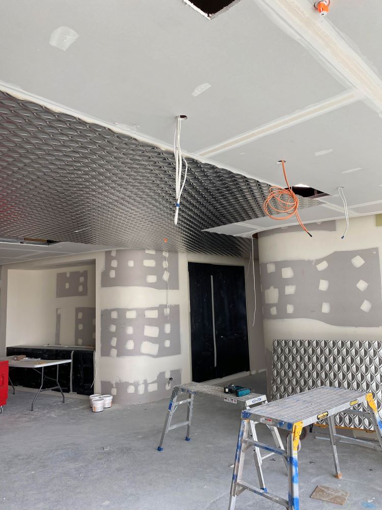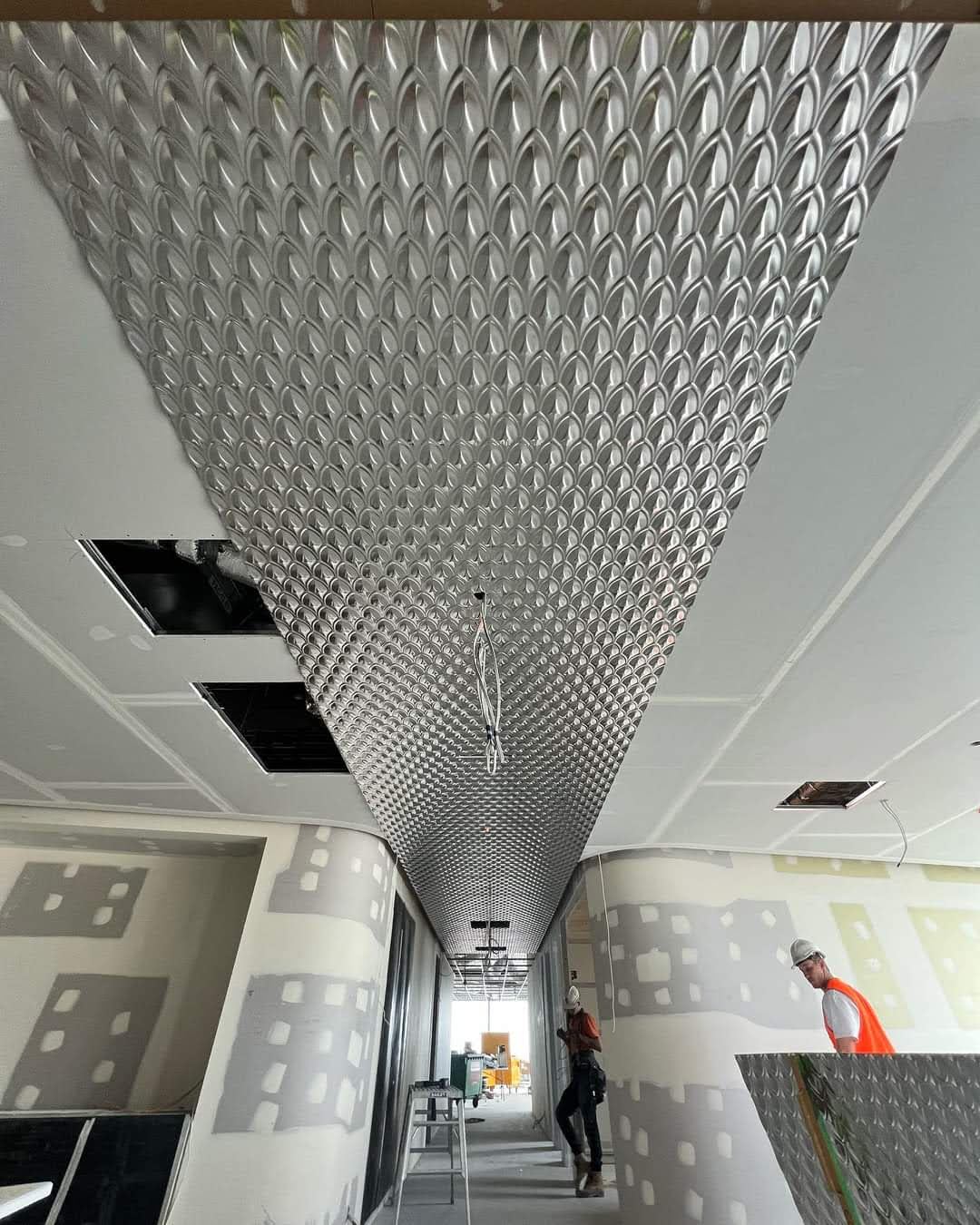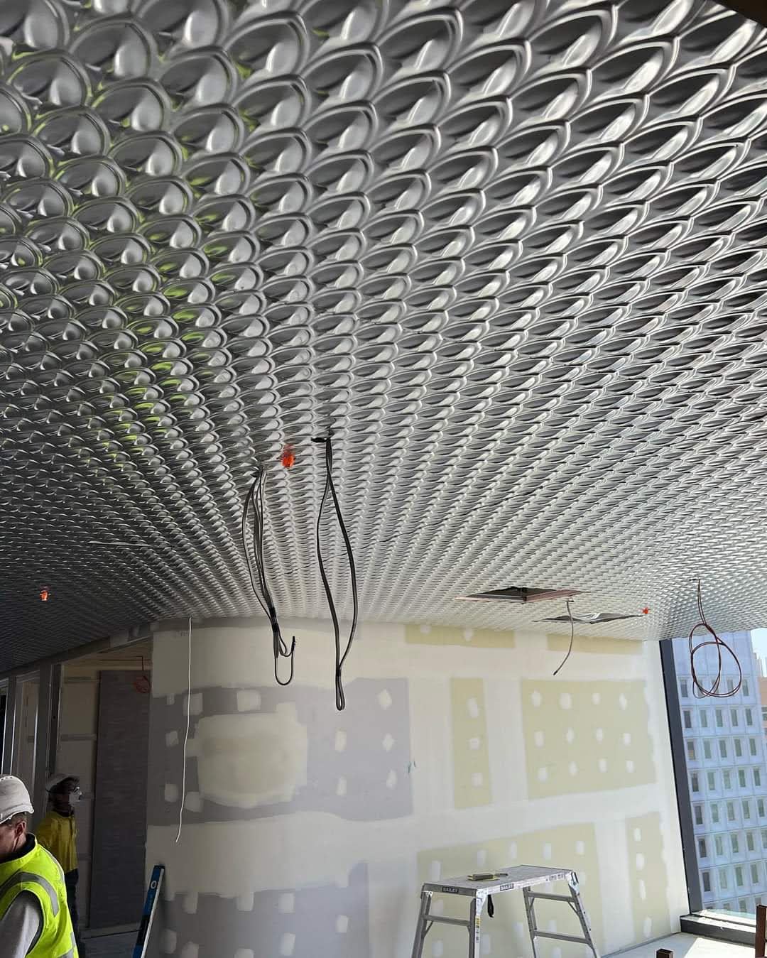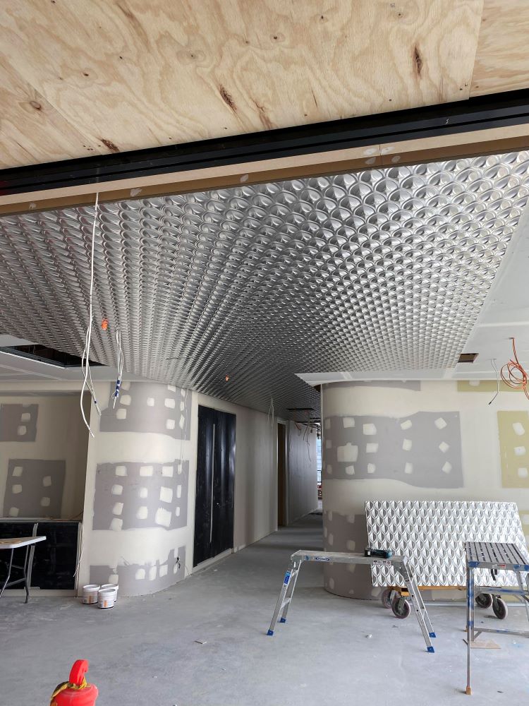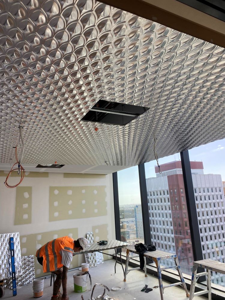 Project DescriptionAdelaide Pressed Metal were contracted by Exclusive Commercial Linings to supply & install approximately 70 square metres of pressed metal panels to the ceilings throughout the common areas & meeting room in the newly reburbished offices at 60 King William Street, Adelaide CBD. The pressed metal design chosen by the interior designer was Medium Fishscale supplied in 900mm x 1800mm panels. This panel is traditionally used as a roofing & cladding material & has no traditional overlap unlike typical pressed metal ceiling panels. The absence of an overlap along with pattern matching, odd angles & working to a shadowline around the ceiling perimetre made it a more challenging installation. Medium Fishscale has a deep profile pressing which required highly skilled workmanship in the cutting of the angles to follow the curve of the walls, millimetre perfect. Mechanical & electrical penetrations all needed to be cut out asthetically & also millimetre perfect. All panel overlaps were gapped and prepared ready for priming & painting. The experienced team at Adelaide Pressed Metal worked around other trades & services and to a strict timeline & schedule, completing the project in 4 days. Adelaide Pressed Metal also worked on the restoration of the Deco fascade of the original building as part of the heritage restoration project (see 60 King William Street Article) & are proud to showcase a mix of heritage restoration and modern application of our pressed metal products & skilled workmanship by our experienced team.