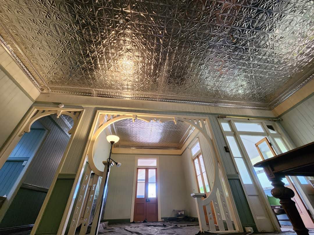 Project DescriptionPressed metal ceiling restoration and installation in a grand heritage home in the suburb of Yeronga. As is custom for the era a different design was installed in each room. Hallway design - Queen of Hearts. Dining Room Design - Fleur. Lounge Design- Acanthus. Cornices - Commonwealth Cornice & Regal Cornice