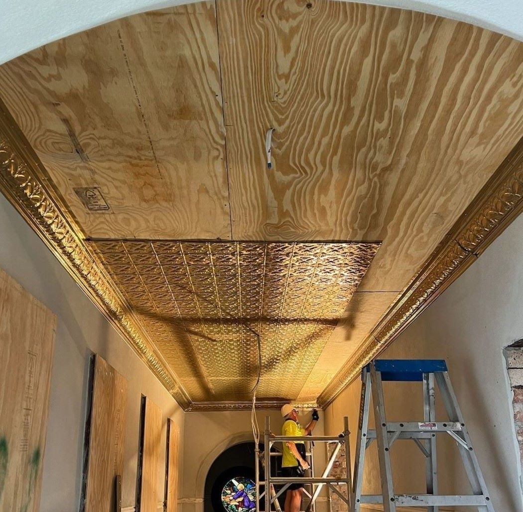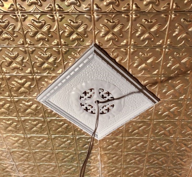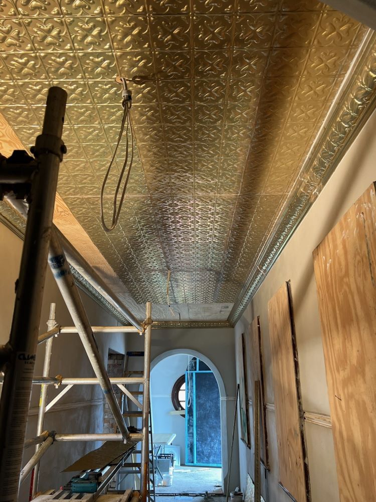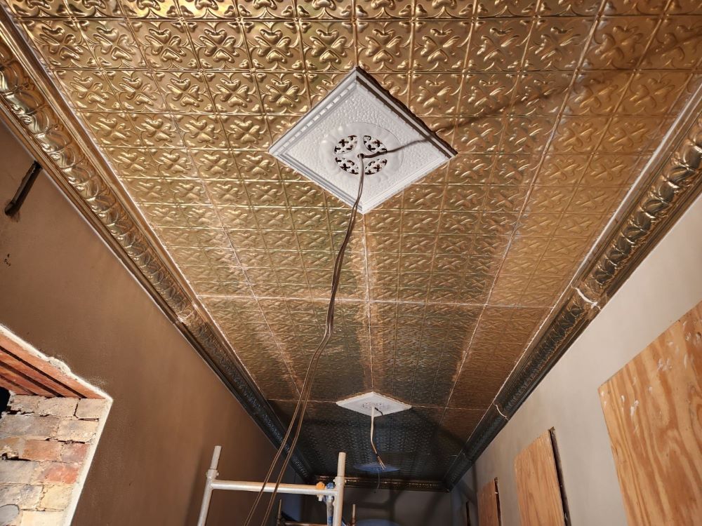 Scope of Contracting WorksReplace & install original rusted pressed metal panels like for like. Create new cornice die like for like to replace original cornice. Create bespoke replica ceiling rose vents to replace original rusted ceiling rose vents.