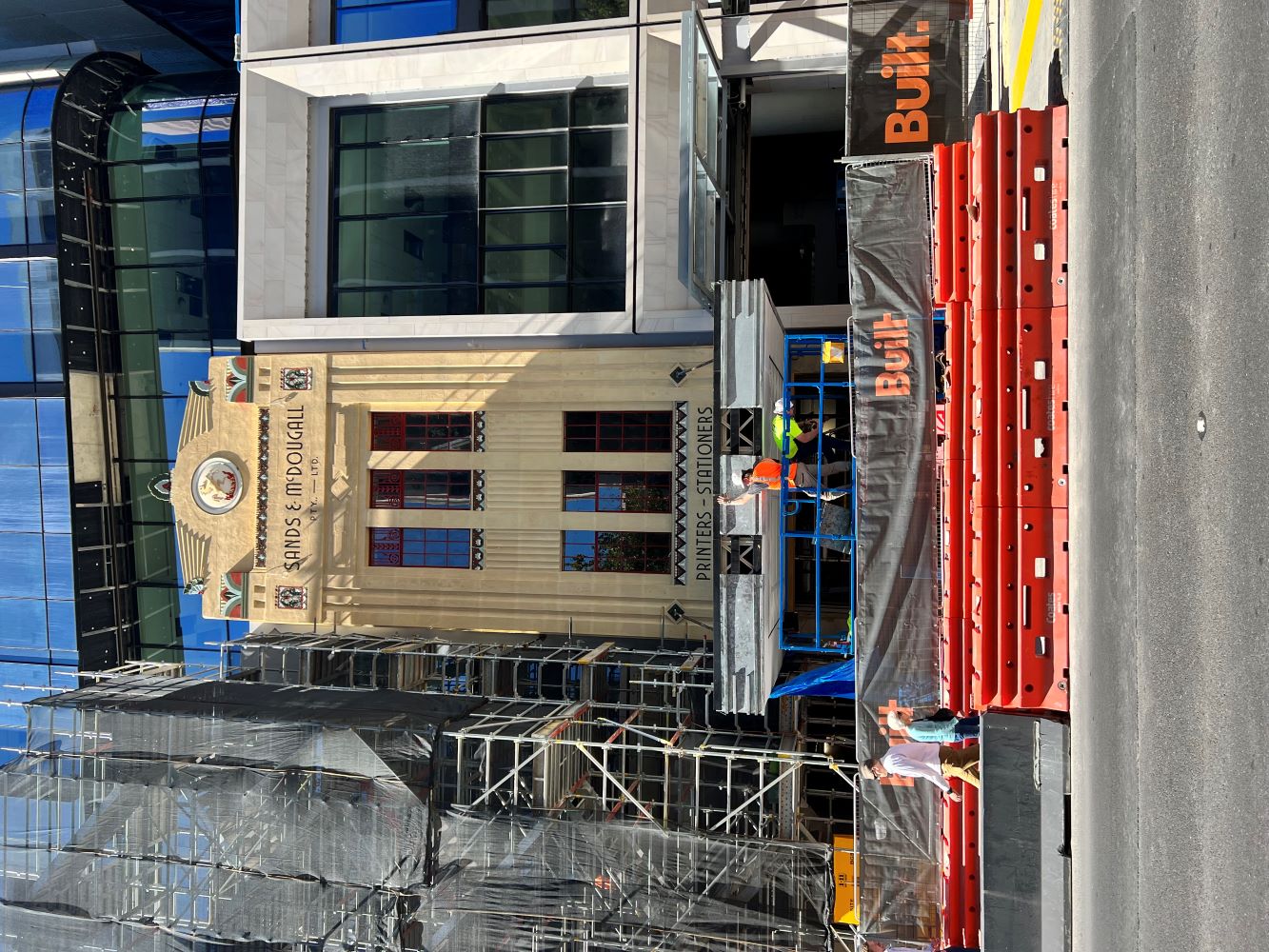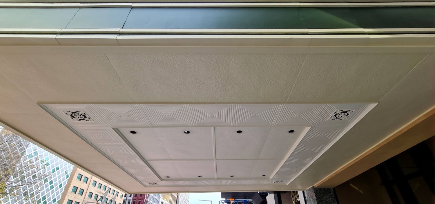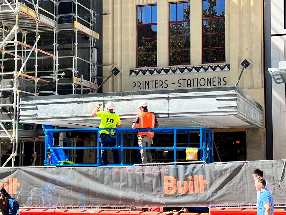 Adelaide Pressed Metal were contracted to carry out works on the Heritage Listed Sands & McDougall Building to repair & restore the original pressed metal verandah ceiling & metal cantilever verandah awning to original condition. Originally 19th century classical style architecture, the facade of the building was remodeled in 1933 to the Art Deco Style in fashion at the time. The original cantilever awning was removed to an offsite location so that repairs to the building facade could be underpinned & restored. The awning was cut in half, taken down & transported to a warehouse where Adelaide Pressed Metal dismantled & repaired the framing of the verandah. The pressed metal was dipped in baths to remove the paint & as much original pressed metal was salvaged as possible. The timber framework was replaced & ceilings battened in preparation for the reinstallation of the pressed metal. Approximately 60% of the original pressed metal material was able to be salvaged with new pressed metal, Lindfield Large design 600mm x 600mm & Fine Roughcast design as the border pattern matching seamlessly with the old original pressed metal. The original pressed metal vents (4 of ) were stripped, restored, soldered together & reinstalled. Due to the closeness of the building to the road the metal awning facades' Art deco features had  taken some heavy vehicle damage over the years especially on the corner of the awning. Adelaide Pressed Metal  refolded and restored the original metal awning facade to the original Art Deco detail.